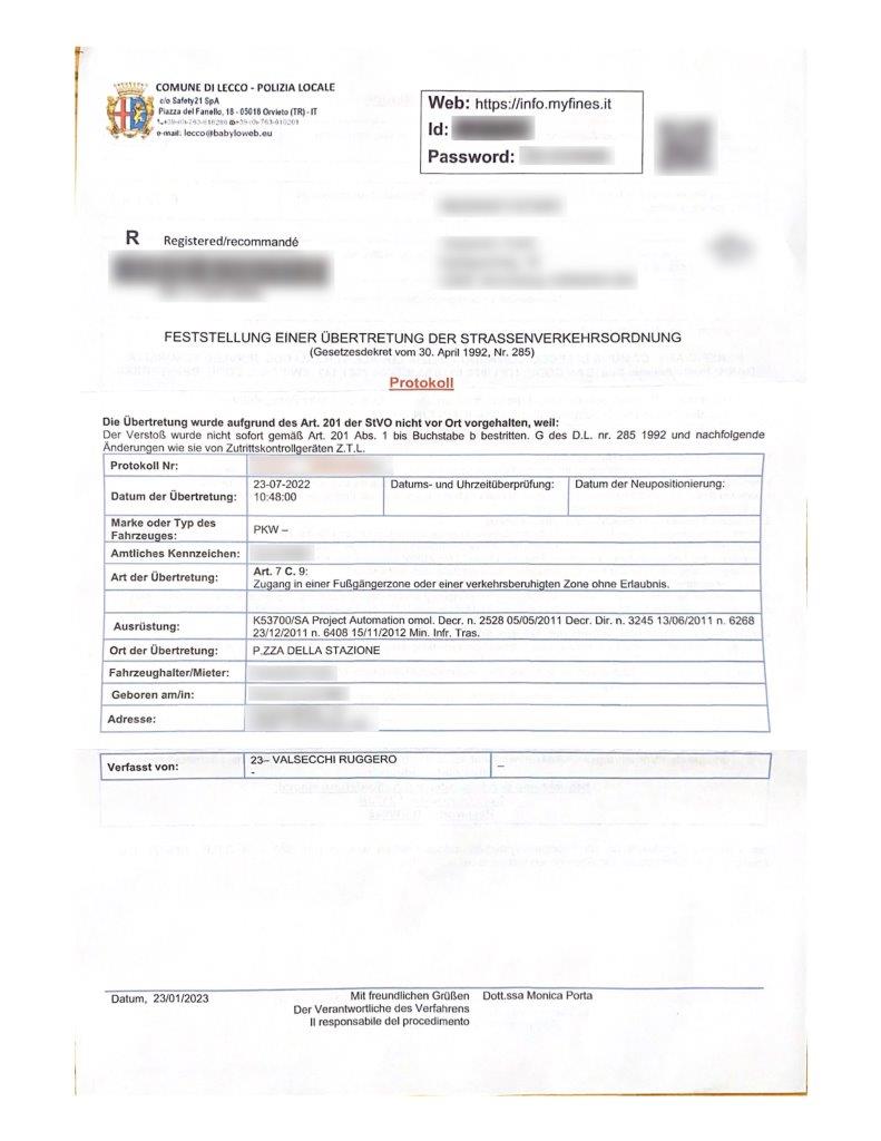 Im Folgenden sehen Sie das Beispiel eines Bußgeldbescheids für unerlaubtes Fahren in einer ZTL. Je nach Stadt und Gemeinde können die Schreiben anders aussehen.